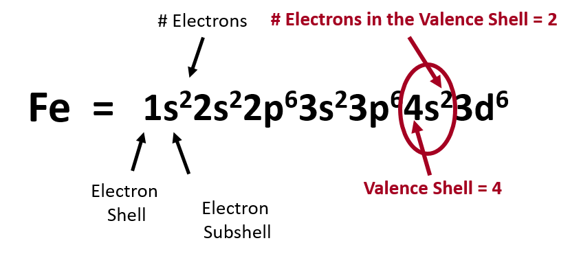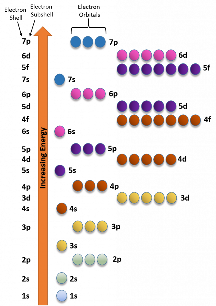Understanding the electron configuration within an element is important for understanding the reactivity of the element. The modern theory of electron behavior is predicted by the field of quantum mechanics. The term quantum is defined as a discrete quantity or ‘packet’ of energy. Electrons in atoms can exist at different energy levels depending on how far away from the nucleus of that atom that they are positioned. Electrons typically have higher energy, the farther away they are (on average) from the nucleus. Four quantum numbers (n, l, ml, and ms) are used to assign the position of an electron within at atom. The principle quantum number (n) refers to the electron shells and corresponds to each period or row on the periodic table. The orbital angular momentum quantum number (l) refers to the electron subshell classification which can be of the s, p, d, or f categories. The magnetic quantum number (ml) refers to the electron orbitals, and the electronic spin number (ms) refers to the electron spin state of the electrons. Each orbital can house 2 electrons, each of which have an opposite spin. Each subshell can house a specific number of electron orbitals: s-subshells have one orbital and can house a total of 2 electrons, p-subshells have three obitals and can house a total of 6 electrons, d-subshells have five orbitals and can house a total of 10 electrons, and f-subshells have seven orbitals and can house a total of 14 electrons.