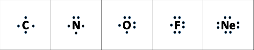 Although it is entirely possible to define the number of valence electrons in an atom through numbers, sometimes it is helpful to have a graphical representation. The graphical notation used for valence electrons is called an Electron-Dot Symbol. To draw an electron dot symbol, start with the abbreviation for the element of interest as the center, signifying the nucleus of the atom. From there, identify the number of valence electrons the atom has, and then add a single dot for each electron around the nucleus. Students often want to place these electron dots around the nucleus randomly, but it is useful for us to pair electron dots together as we might in an orbital. Following the same rules discussed above about orbital filling, the electron dot symbols for multiple atoms can be seen in the figure below. The easiest way to fill the orbitals is to start at one edge, add a dot, and fill in the rest of the dots one at a time by rotating clockwise on the edges of a square boxing in the nucleus until you have used all of the valence electrons. Note that each side should never have more than two dots, and that you should follow Hund’s rule when constructing your Electron-Dot Symbol. Each side should get one electron before the electrons are paired up.