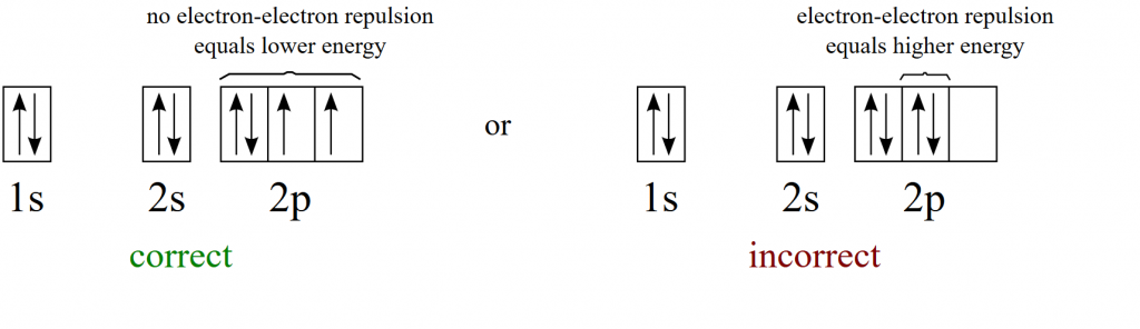 Electron orbitals are filled according to three major rules. The Pauli Exclusion Principle states that electrons cannot occupy the same space at the same time, and thus, no two electrons can share the same combination of four quantum numbers. Second according to the Aufbau principle, electrons orbiting one or more atoms will fill the lowest available energy levels before filling higher energy levels. The final rule that we need to follow is Hund’s rule which states that when electron orbitals have equal energy level, electrons must fill each of those orbitals as single electrons before they can begin to pair with electrons of opposite spin states. The periodic table and the electron configuration solitaire tool can be used to determine the electron configuration of any element. Electron configurations can be written using the noble gas shorthand rules.