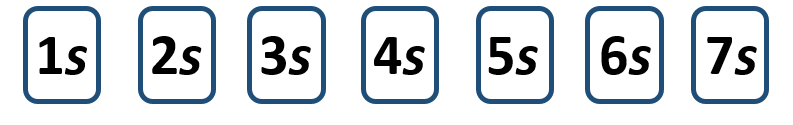 If you are having some trouble using the periodic table to determine electron configurations and don’t want to memorize the energy level diagram. There is one more way to help you determine the correct electron configuration of an element. This is also a good method to use to double check you work, when you are using a periodic table to help you determine electron configurations. The method is ‘electron configuration solitaire’. I call this method solitaire because that is what it reminds me of every time I draw this chart. Essentially, you are going to lay out all of the electron subshells into neat rows (left to right that are arranged by subshell type (s, p, d, and f). The first row will contain all of the s-subshells arranged from the lowest to the highest shell (n) number. So the first row would look like this:
