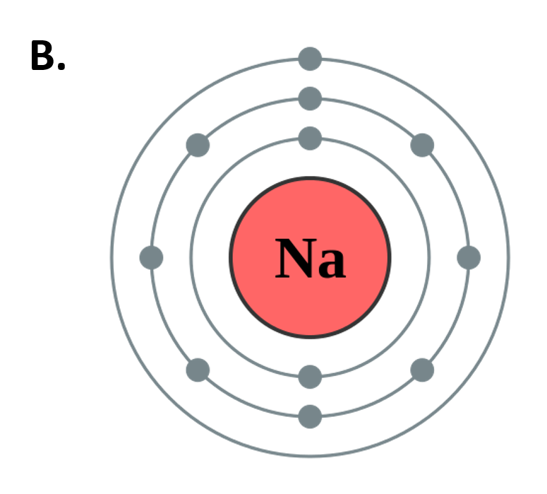 Figure 2.10 The Periods of the Periodic Table Represent Electron Shells (A) Each electron shell is represented by a row or period on the the periodic table. (B) A representation of the electron shells of the sodium atom. Sodium has an atomic number of 11, thus it has 11 protons and 11 electrons in the elemental form. The first and innermost electron shell can hold a total of 2 electrons, as indicated by the gray circles in the diagram. The second electron shell can hold 8 electrons and is completely full. The third electron shell has the capacity to hold 18 electrons, however, in sodium, there is only one more electron that needs to be placed after filling the first and second electron shells. Thus, the third electron shell of sodium only has 1 electron.