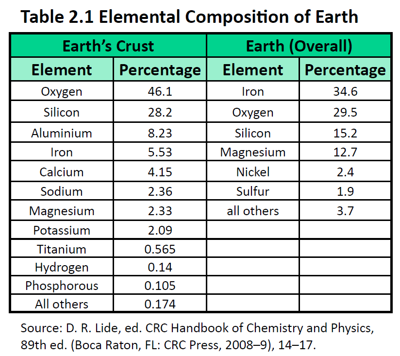 The elements vary widely in abundance. In the universe as a whole, the most common element is hydrogen (about 90%), followed by helium (most of the remaining 10%). All other elements are present in relatively minuscule amounts, as far as we can detect. On the planet Earth, however, the situation is rather different. Oxygen makes up 46.1% of the mass of Earth’s crust (the relatively thin layer of rock forming Earth’s surface), mostly in combination with other elements, while silicon makes up 28.5%. Hydrogen, the most abundant element in the universe, makes up only 0.14% of Earth’s crust. Table 2.1 lists the relative abundances of elements on Earth as a whole and in Earth’s crust. Table 2.2 lists the relative abundances of elements in the human body. If you compare Table 2.1 and 2.2, you will find disparities between the percentage of each element in the human body and on Earth. Oxygen has the highest percentage in both cases, but carbon, the element with the second highest percentage in the body, is relatively rare on Earth and does not even appear as a separate entry in Table 2.1; carbon is part of the 0.174% representing “other” elements. How does the human body concentrate so many apparently rare elements?