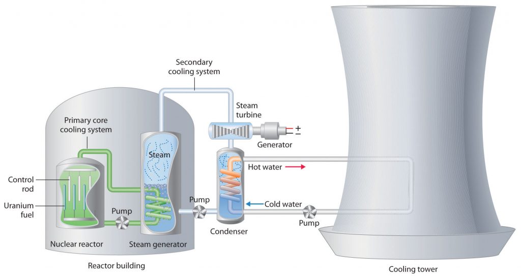 Figure 2.22 A Light-Water Nuclear Fission Reactor for the Production of Electric Power. The fuel rods are made of a corrosion-resistant alloy that encases the partially enriched uranium fuel; controlled fission of 235U in the fuel produces heat. Water surrounds the fuel rods and moderates the kinetic energy of the neutrons, slowing them to increase the probability that they will induce fission. Control rods that contain elements such as boron, cadmium, or hafnium, which are very effective at absorbing neutrons, are used to control the rate of the fission reaction. A heat exchanger is used to boil water in a secondary cooling system, creating steam to drive the turbine and produce electricity. The large hyperbolic cooling tower, which is the most visible portion of the facility, condenses the steam in the secondary cooling circuit; it is often located at some distance from the actual reactor.