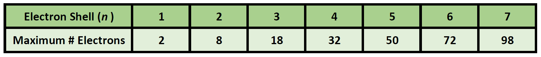 At a basic level, the energy shells can be thought of like the layering of an onion, with the first layer being the smallest and closest to the core of the nucleus, and the subsequent layers being larger and farther away from the core. Larger shells have more space and can hold more electrons. The general formula for determining how many electrons can be housed in each shell is 2n2 and is shown in Table 2.4. While this table predicts that that outer shells, which are the largest shells can contain 50, 72, and 98 electrons, elements that have this many electrons in those shells have never been discovered. It is likely that they are too big and unstable to exist.
