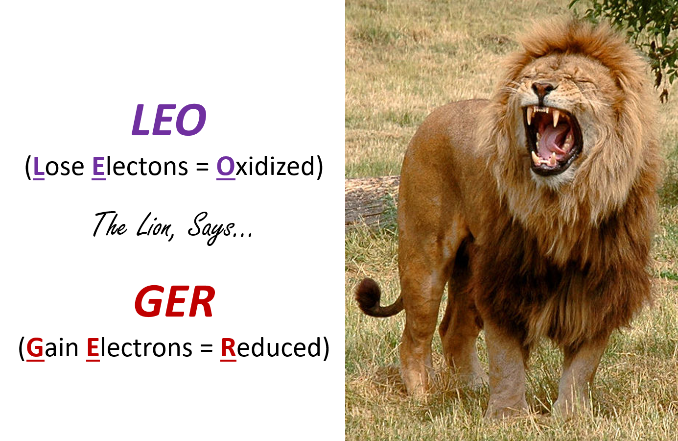 As shown in Figure 7.10, an easy mnemonic for helping you remember which member gains electrons and which member loses electrons is ‘LEO the lion says GER’, where LEO stands for Lose Electrons = Oxidized and GER stands for Gain Electrons = Reduced.