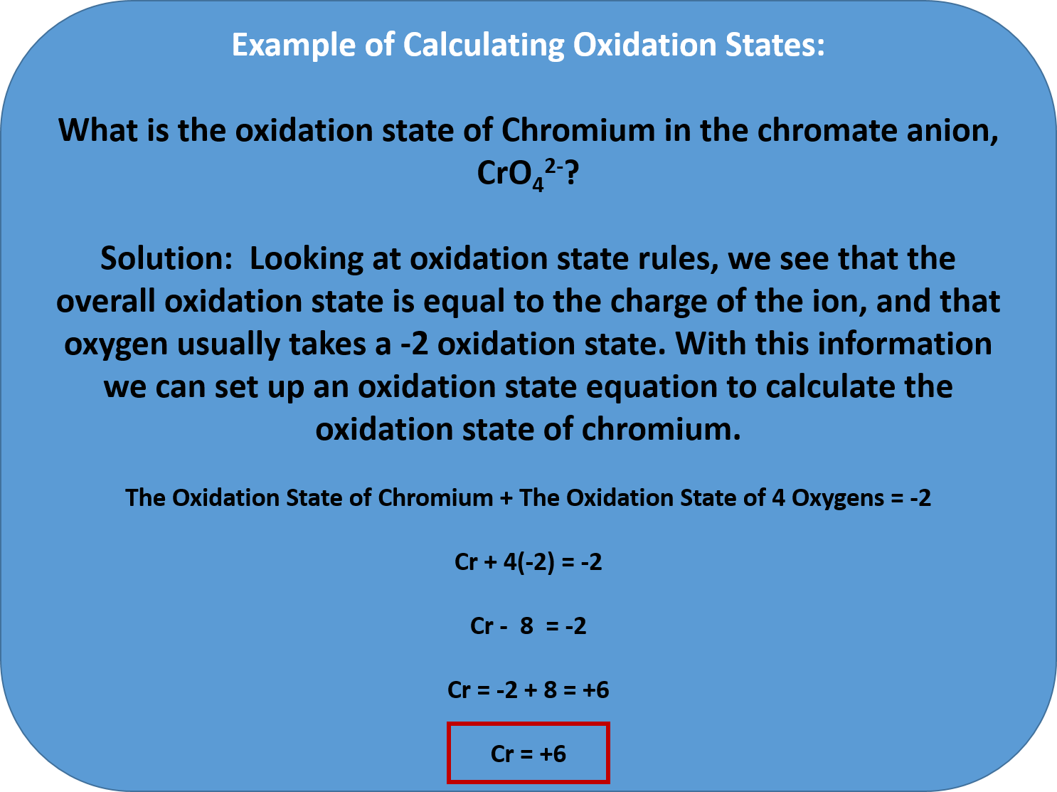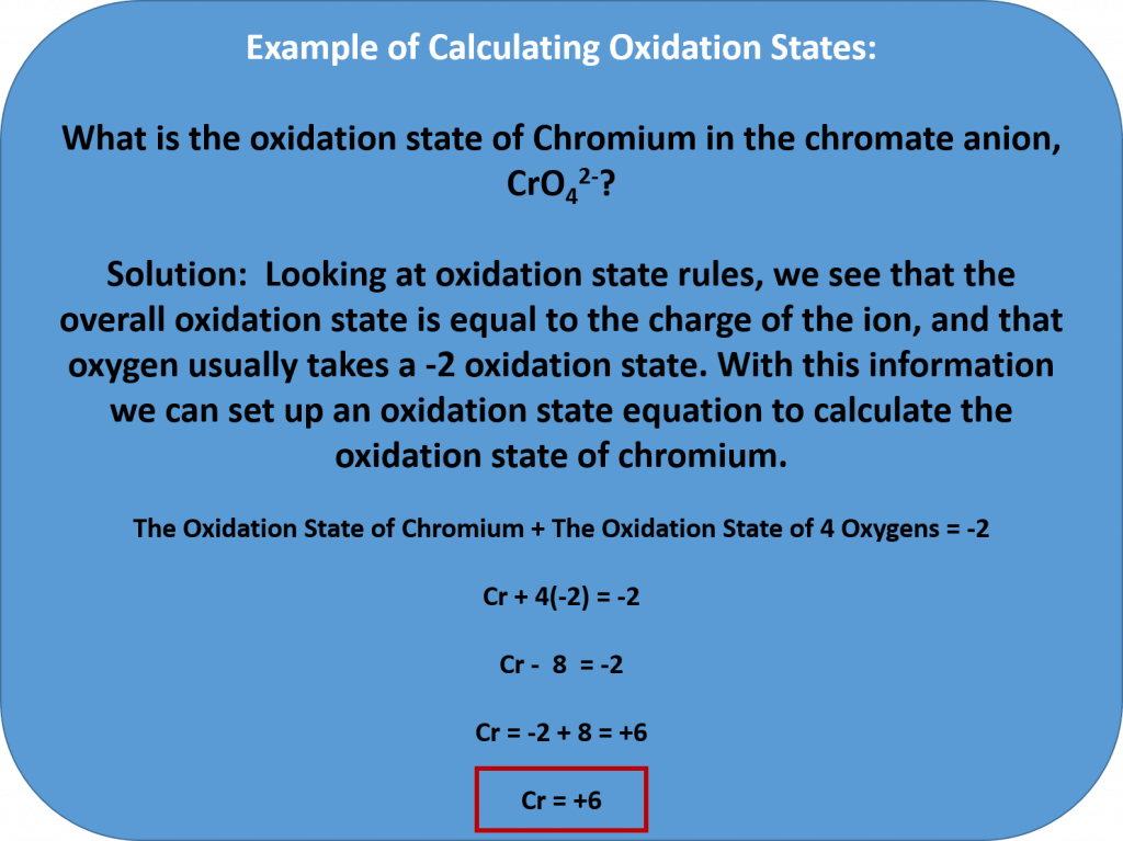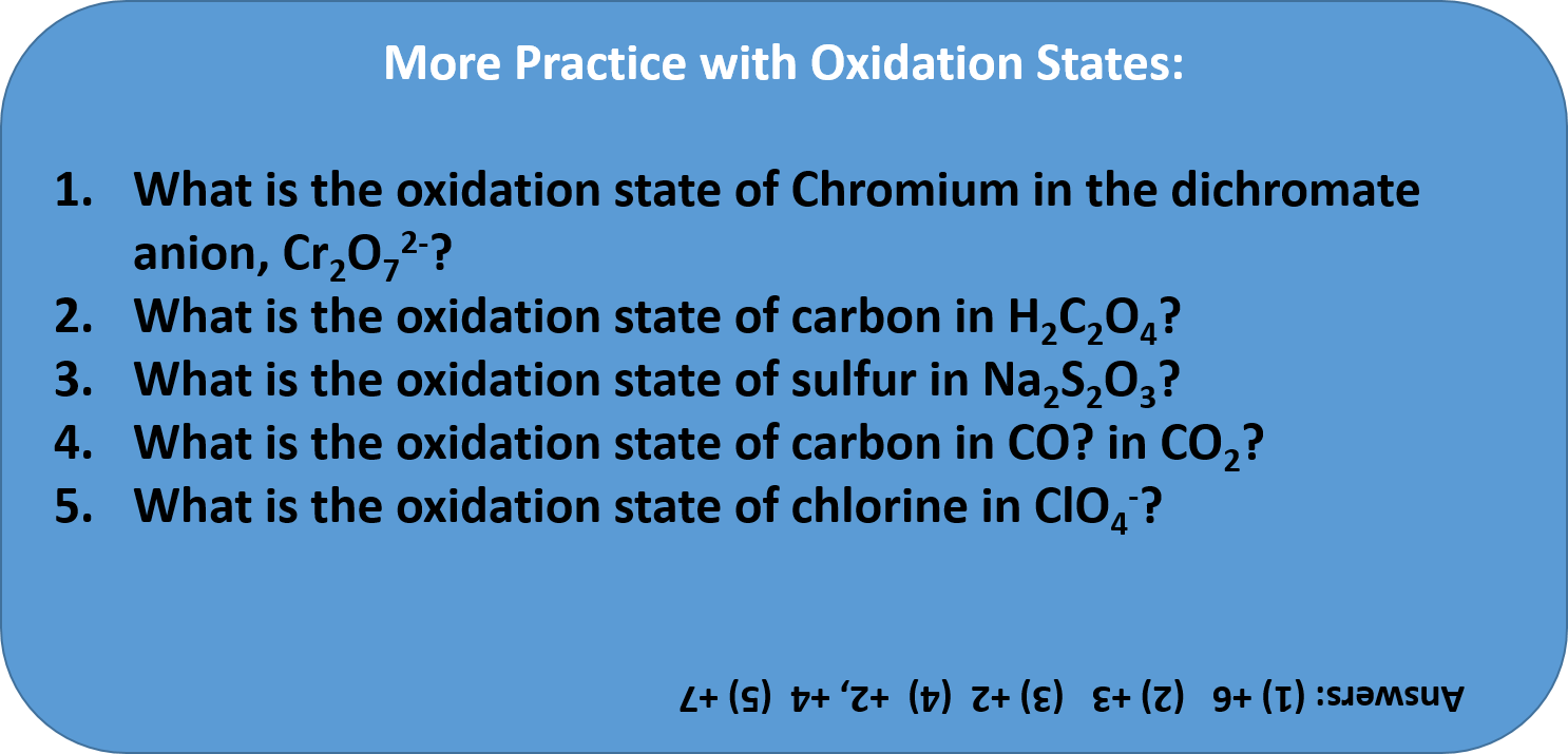 2. The total oxidation state of all atoms in a neutral species is 0 and in an ion is equal to the ion charge. (For example, the overall oxidation state of NaCl = 0, even though the oxidation state of Na+ in this bond is +1 and the oxidation state of the chlorine atom, Cl–, is -1. When you add them together they equal 0.  In the case of an ion, the overall charge is always indicated. For example, the overall charge of a OH– ion is -1, while the oxygen in the OH– has a -2 oxidation state and the hydrogen has a +1 oxidation state.)