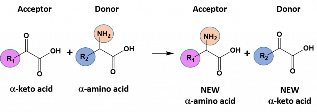 In group transfer reactions, a functional group will be transferred from one molecule that serves as the donor molecule to another molecule that will be the acceptor molecule. The transfer of an amine functional group from one molecule to another is common example of this type of reaction and is shown in Figure 7.3 below.