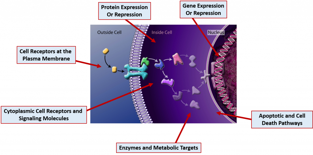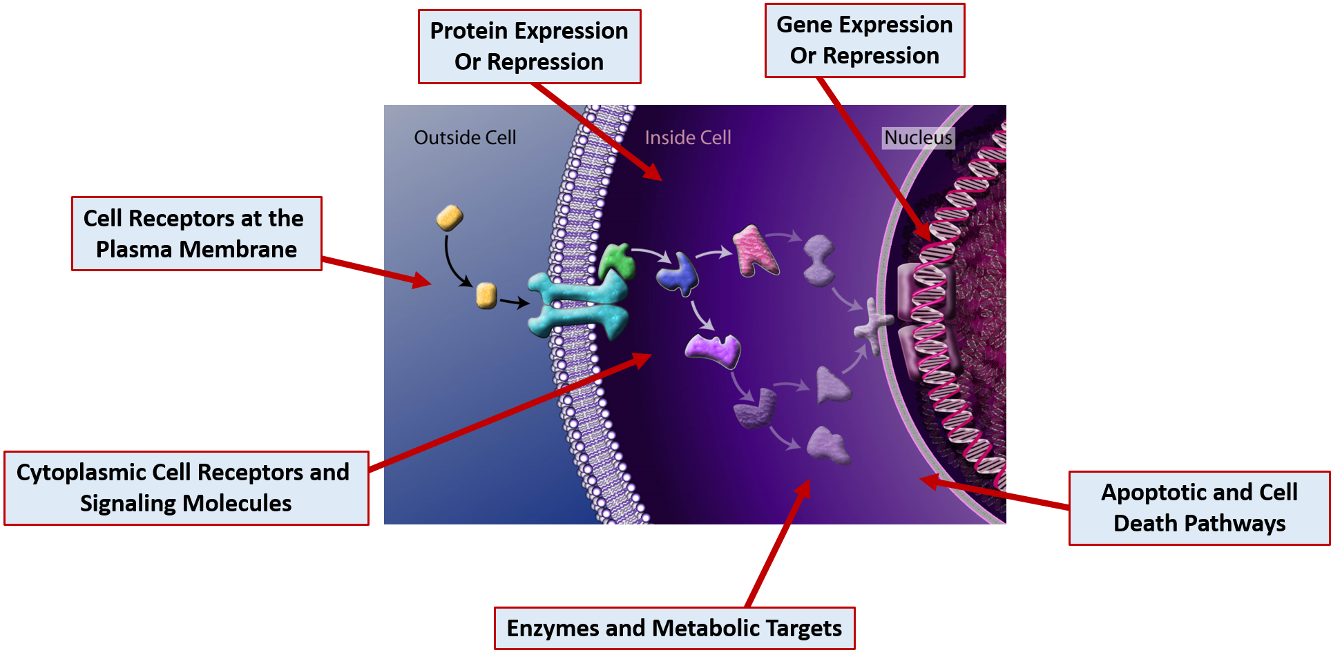 This section will focus primarily on common drug MOAs. Drugs can act on molecular targets from any of the major macromolecule groups or from mixtures of the different groups.  DNA and RNA often form complexes with proteins and many cellular receptors are modified with carbohydrate structures forming both glycoproteins and glycolipids. Drugs can have effects through the binding of molecular targets are very specified locations in the cell as depicted in Figure 7.18