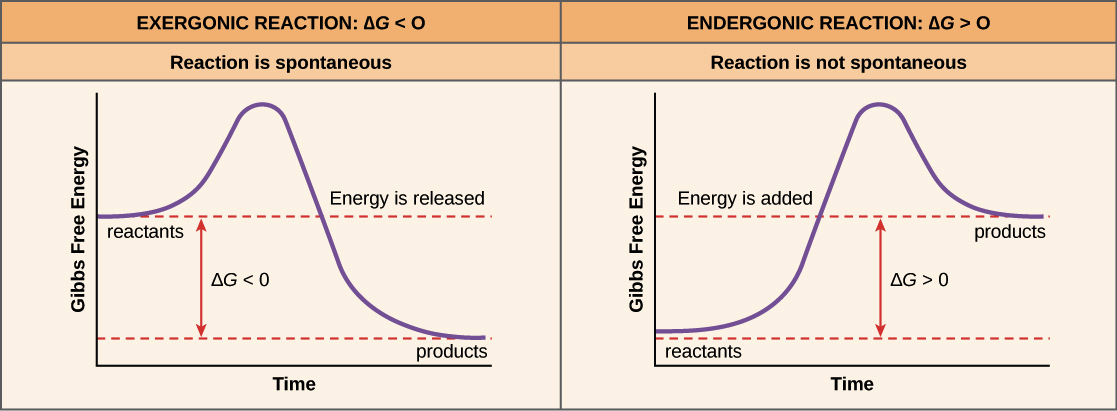 Figure 7.14 Gibbs Free Energy Diagrams. When reactions are spontaneous and release energy (exergonic) the ΔG will be negative (left hand graph), whereas when reactions are not spontaneous and require energy to be added to the reaction (endergonic) the ΔG will be positive (right hand graph).