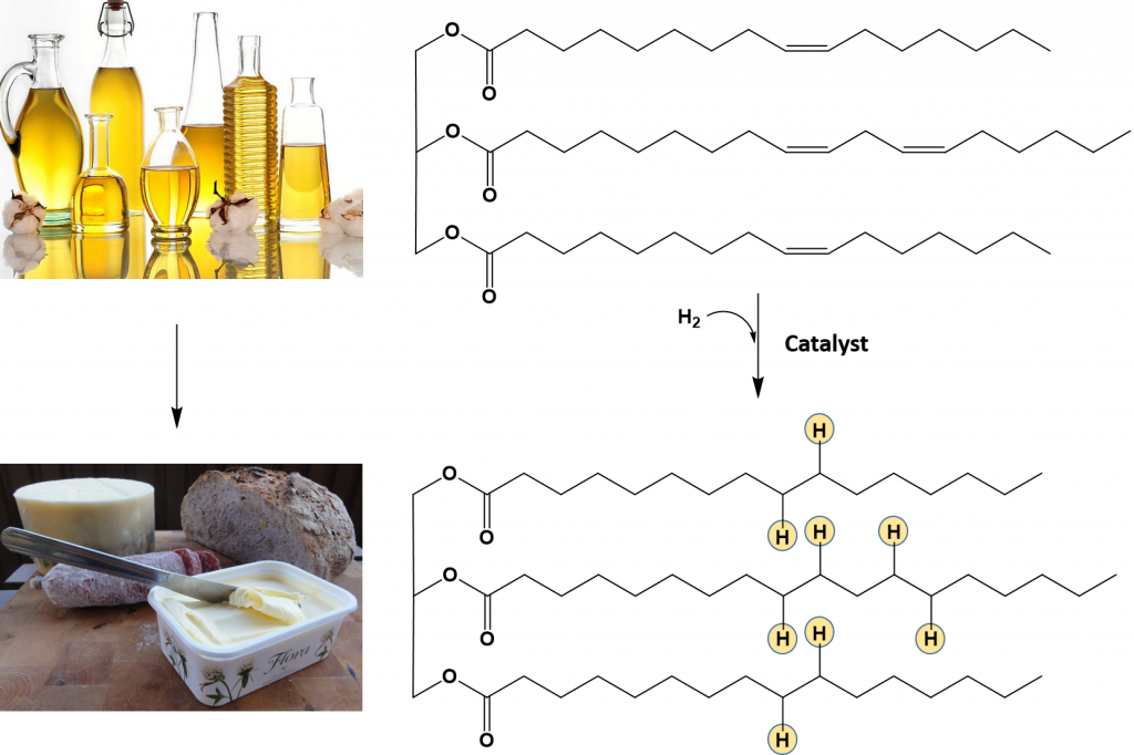 Reactions that mediate the formation and removal of carbon-carbon double bonds are also common in biological systems and are catalyzed by a class of enzymes called lyases. The formation or removal of carbon-carbon double bonds is also used in synthetic organic chemistry reactions to create desired organic molecules. One of these types of reactions is called a hydrogenation reaction, where a molecule of hydrogen (H2) is added across a C-C double bond, reducing it to a C-C single bond.  If this is done using unsaturated oils, the unsaturated fats can be converted into saturated fats (Figure 7.4).  This type of reaction is commonly done to produce partially hydrogenated oils converting them from liquids at room temperature into solids.  Margarines made from vegetable oil are made in this manner. Unfortunately, a by-product of this reaction can be the formation of TAGS containing trans double bonds. Once the health hazards of consuming trans fats was recognized, the Food and Drug Administration (FDA) placed a ban on the inclusion of trans fats in food products.  This ban was enacted in the summer of 2015 and gave food-makers three years to eliminate them from the food supply, with a deadline of June 18, 2018.