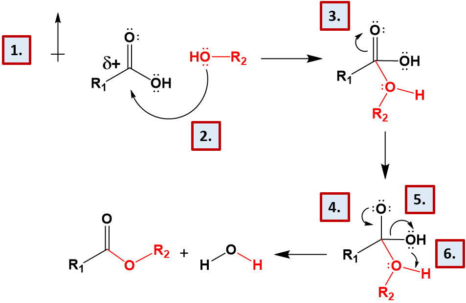 Figure 7.9 Reaction Mechanism of Ester Formation. (1) This reaction mechanism is set up by the nature of carboxylic acid functional group. The presence of the carbonyl oxygen and the alcohol functional groups create an electron withdrawing situation, where the electronegative oxygen atoms pull the electrons away from the central carbon atom.  This creates a very polar situation, where the central carbon has a strong partial positive character. (2) The strong partial positve character of the central carbon atom of the carboxylic acid attracts one of the lone pair electron groups from the alcohol functional group, shown in red. This enables a new covalent bond to form between the alcohol functional group and the carboxylic acid functional group. This creates an intermediate that has five bonds attached to the central carbon and three bonds attached to the oxygen atom of the incoming alcohol.  (3) The intermediate with five bonds to the central carbon is unstable and wouldn’t normally form, however the  presence of the carbonyl oxygen makes the reaction more favorable. It will be able to temporarily absorb the extra electron potential around the central carbon atom, due to its electronegative character and the double bond will temporarily shift up onto the central oxygen forming a lone pair intermediate. (4) The extra lone pair on the carbonyl oxygen shifts back down to reform the double bond with the central carbon. (5) This causes the shared electron pair between the central carbon atom and the original alcohol functional group to shift over to the alcohol, breaking the covalent bond. (6) The extra lone pair of electrons on the free alcohol group take the proton from the new incoming alcohol group forming a molecule of water and the final ester structure.