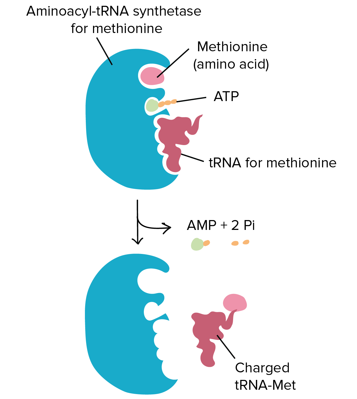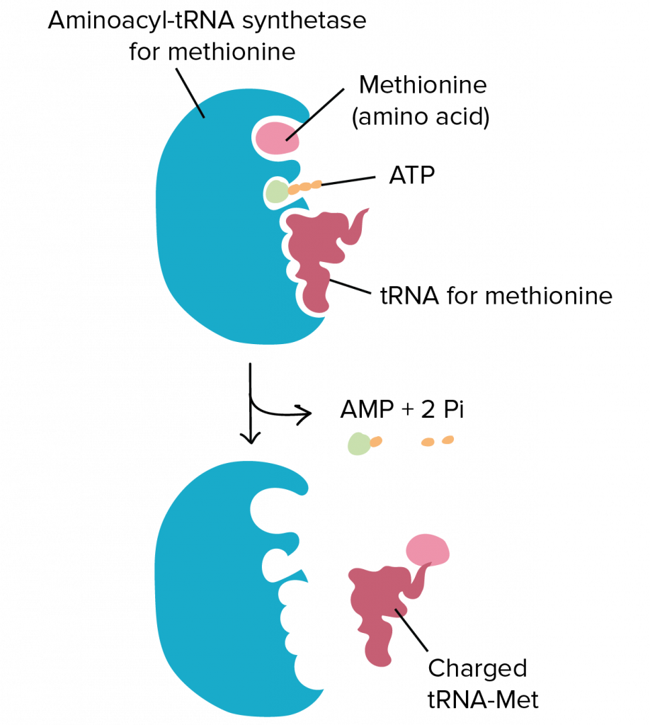 Figure 7.6 Ligation Reaction Covalently Attaching Methionine with the Appropriate tRNA. The amino-acyl tRNA synthetase enzyme for methionine (shown in blue) covalently attaches methionine (light pink) with the methionine tRNA molecule (dark pink).  This reaction requires the energy provided from the breakdown of the ATP molecule into AMP, releasing energy with the breakdown of the phosphate bonds into two inorganic phosphate ions (2 Pi).