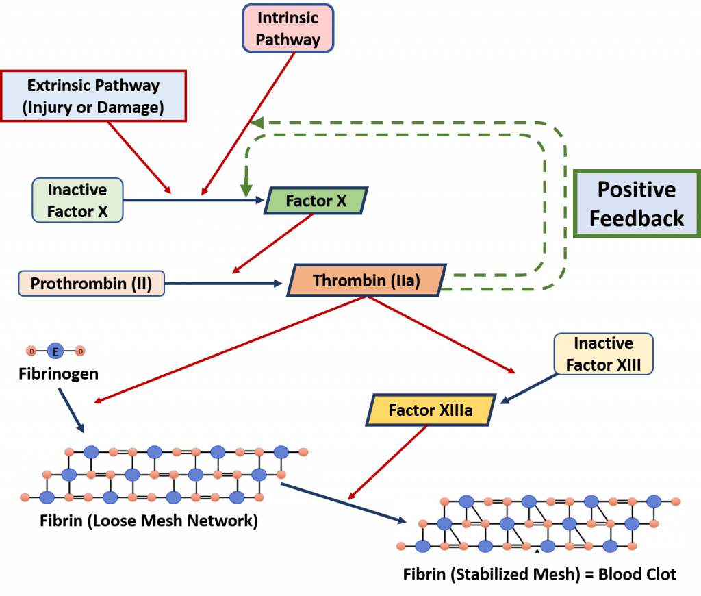 An example of a positive feedback loop is the blood clotting cascade which is originally initiated by external damage to the vasculature (Figure 8.2). During a damage event, extrinsic factors begin the initiation of the blood clotting cascade.  The proteins involved in this process are usually held inactive by being produced in a much larger form than is required.  To activate the protein, the protein needs to be cleaved into a smaller, active complex.  When a protein is held in a large inactive state and cleaved to yield the active component, it is called a zymogen.  The blood clotting cascade contains many zymogens. The first zymogen to be activated is Factor X.  When Factor X is cleaved, it becomes active and proceeds to cleave the next downstream target, Prothrombin II. This produces the active component, Thrombin IIa which has multiple effects.  First, it cleaves the protein Fibrinogen to produce Fibrin. Fibrin then begins to form a clotting complex with itself.  This is referred to as the loose mesh network. Activated Thrombin IIa also cleaves the inactive form of Factor XIII.  Activated Factor XIIIa causes crosslinks to form in the loose mesh network creating the finalized stable mesh that forms the blood clot. To accelerate this process further, Thrombin IIa also has two positive feedback effects.  It can also cleave Inactive Factor X creating more activated Factor X and ultimately more activated Throbmin IIa.  It also increases the activity of the instrinsic blood clotting cascade, which further upregulates the activation of Factor X.