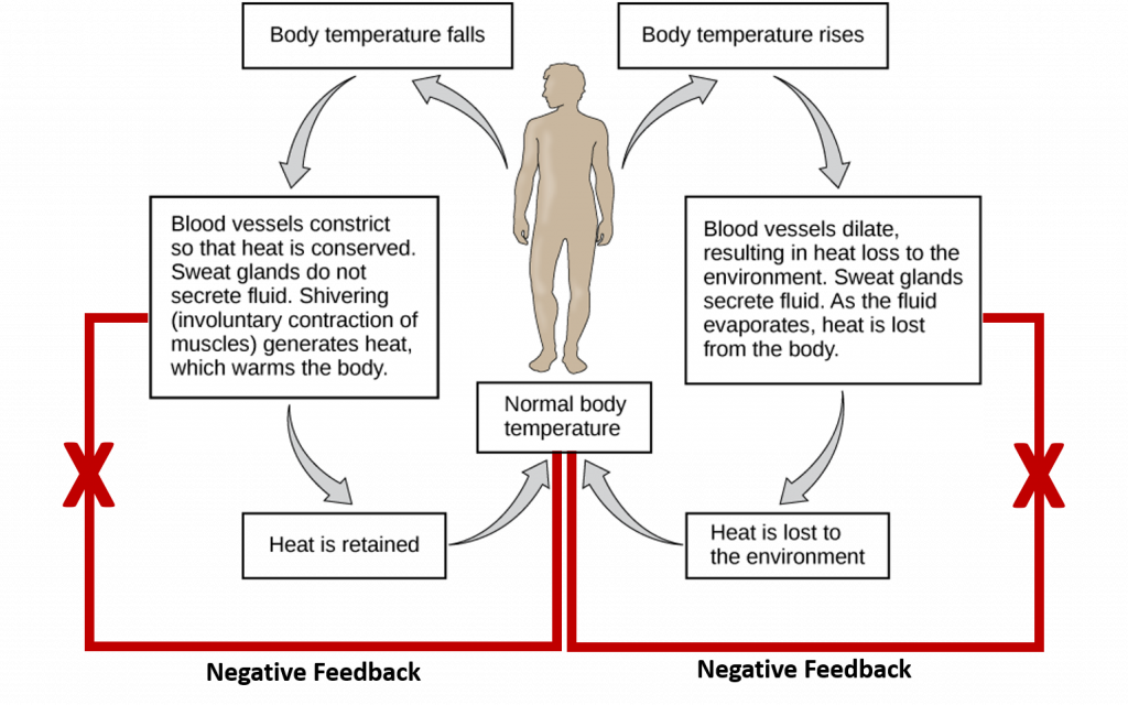 Within the realm of homeostasis, temperature control is a good example that uses negative feedback. Nerve cells (the sensors) relay information about body temperature to the hypothalamus (the integrating center). The hypothalamus then signals several effectors to return the body temperature to 37oC (the set point). Two effectors activated in the process when core temperature is too high are the sweat glands which serve to cool the skin and the blood vessels which undergo vasodilation (or enlarging) so the body can give off more heat. Once the core temperature is brought back into normal range, the sensor will send negative feedback messages to the integrating center to turn off the process (ie turn off the sweat glands and inhibit further vasodilation). Both internal and external events can induce negative feedback mechanisms. The two examples above represent internal mechanisms utilized to return the body within the normal temperature range.  However, we can also mediate the cooling of the body through external factors, such as removing a warm hat and gloves or pouring a cool glass of water over our head. Both external and internal mechanisms for cooling can return the temperature of the body to within the normal range and elicit the negative feedback response. Similarly, if body temperature is below the set point, muscles shiver to generate heat and the constriction of the blood vessels helps the body retain heat.