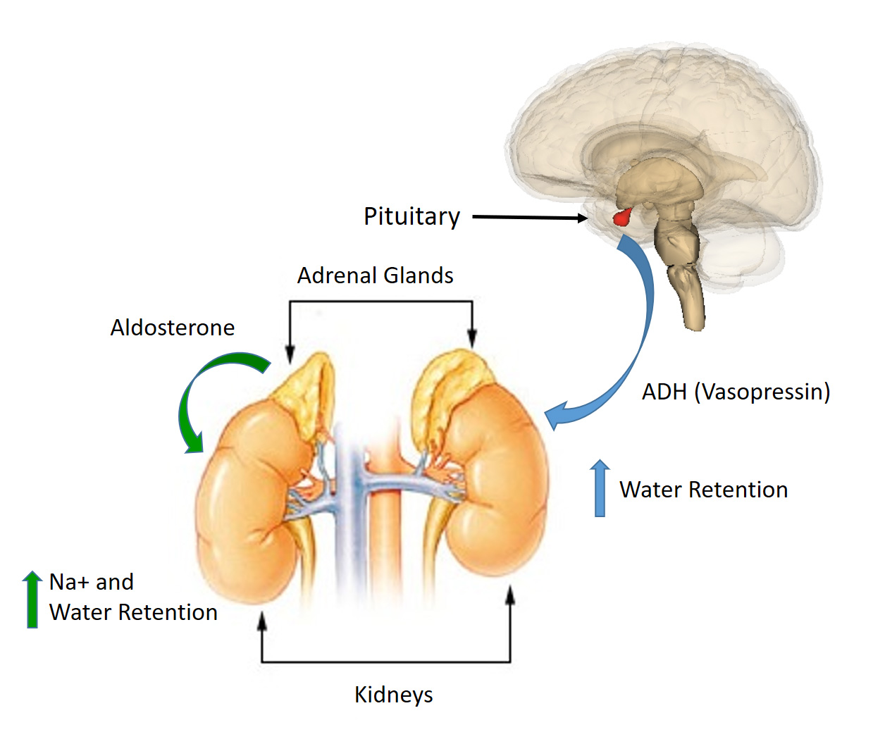 Figure 8.3: Effects of Aldosterone and ADH on Kidney Function. When fluid levels in the body are low, ADH (Vasopressin) is secreted by the pituitary gland and Aldosterone is secreted by the adrenal glands. ADH decreases the loss of water whereas Aldosterone increases the reabsorbtion of Na+ within the collecting duct of the kidneys. Water is reabsorbed with the Na+ causing an increase in fluid retention and decreased urine output.