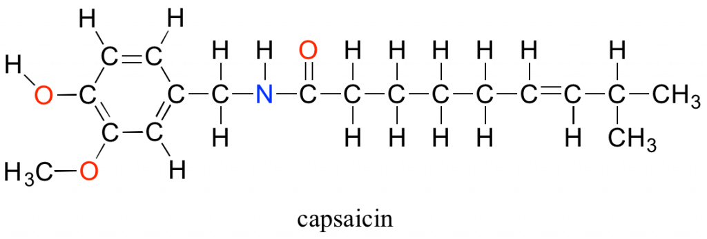 Composed of the four elements carbon, hydrogen, oxygen and nitrogen, capsaicin is produced by the pepper plant for the purpose of warding off hungry mammals. The molecule binds to and activates a mammalian receptor protein called TrpV1, which in normal circumstances has the job of detecting high temperatures and sending a signal to the brain – ‘it’s hot, stay away!’ This strategy works quite well on all mammalian species except one: we humans (some of us, at least) appear to be alone in our tendency to actually seek out the burn of the hot pepper in our food.
