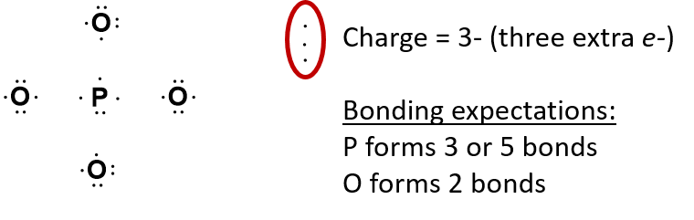 For PO43- list out all the atoms with the phosphorus placed at the center. Also, list any extra electrons due to the negative charge on the overall molecule and your expectations about the bonding capacity of each atom to reach the octet. Note that we have four oxygen atoms that have to bond to the phosphorus. Thus, we would expect P to be in the 5 bond state for this molecule (ie. 3 won’t be enough). Note that the lone pair of electrons in the P is split and each electron is used for the expanded orbital bonding with other atoms.