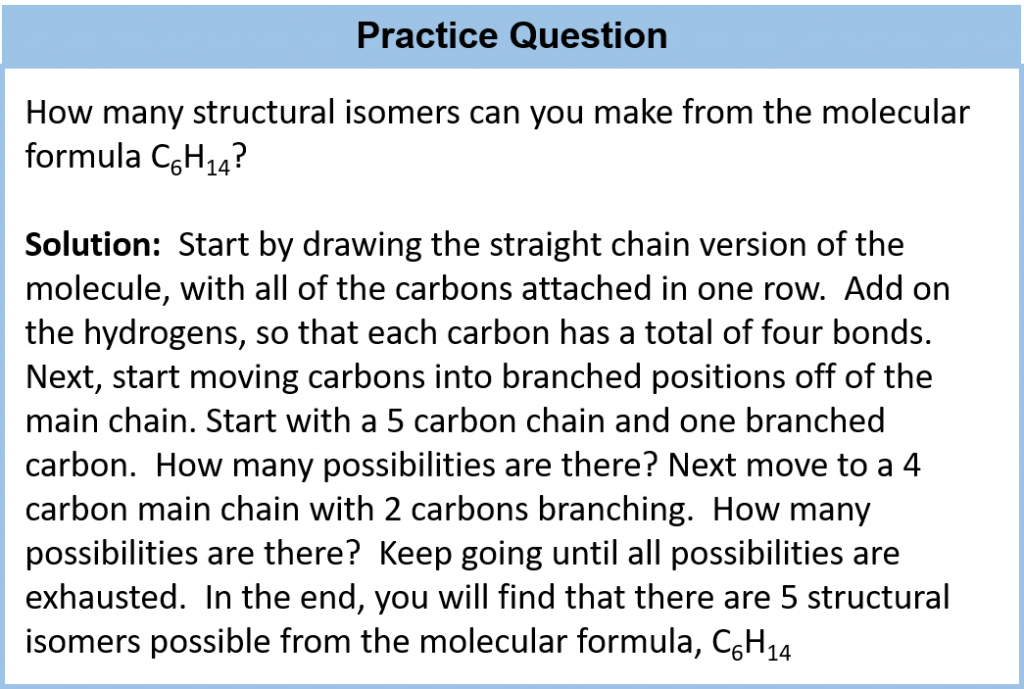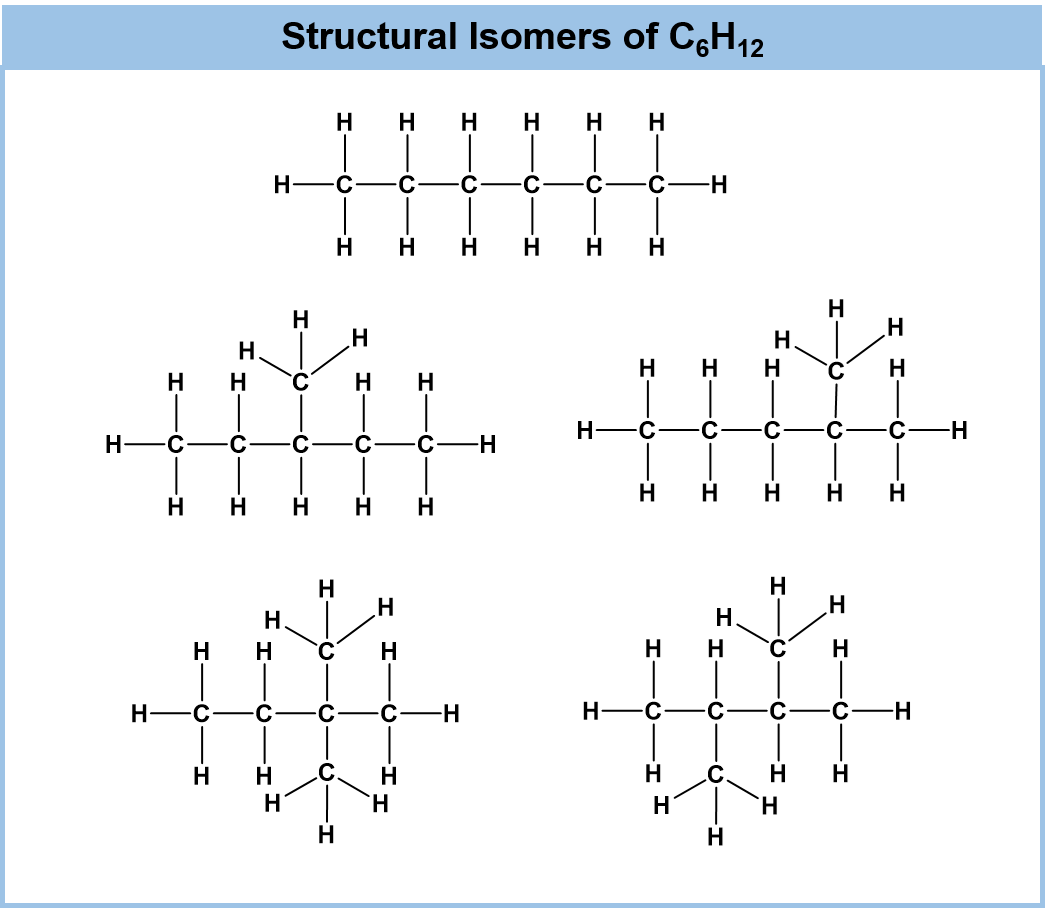 In cases like this, the bonding order in the organic molecule isn’t important. However, for most biologically important reactions, the shape of the molecule is usually critical for the function of the molecule, very similar to a key fitting into a lock. Thus, the bonding order becomes very important. For example, C5H12 shown in the equation above can be bonded together in more than one way:
