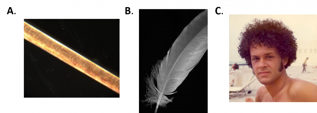 Figure 10.3 The importance of disulfide bridges. Disulfide bonds are highly abundant in hair and feathers. A. Depicts a 200X magnification of a human hair. B. Shows the structure of a feather without any coloration. C. Shows a permanent hair-style.