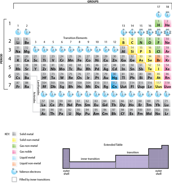 Fig 3.7 Periodic Table with Lewis Structures. Each family shows a representative lewis structure for that group of elements. For the nonmetals (Families 4A, 5A, 6A, and 7A) they can accept a complementary number of shared bonds to reach the octet state. Family 4A can share 4 covalent bonds (4 + 4 = 8), whereas Families 5A, 6A, and 7A can share 3, 2, and 1 covalent bond(s), respectively, to achieve the octet state. Exceptions to the octet rule do exist. For example, hydrogen can be considered to be in Group 1 or Group 7A because it has properties similar to both groups. Hydrogen can participate in either ionic or covalent bonding. When participating in covalent bonding, hydrogen only needs two electrons to have a full valence shell. As it has one electron to start with, it can only make one covalent bond. Similarly, boron has 3 electrons in its outer shell. This nonmetal typically forms 3 covalent bonds, having a maximum of 6 electrons in its outer shell. Thus, boron can never reach the octet state. Other atoms can have expanded orbitals and accept additional covalent bonds. Two of these that are important for living systems is sulfur and phosphorus. By the octet rule, sulfur can make 2 covalent bonds and phosphorus 3 covalent bonds. Sulfur can also have expanded orbitals to accept 4 or 6 covalent bonds, and phosphorus can expand to 5 covalent bonds.