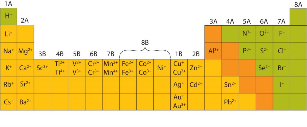 Fig 3.5. Charges of Monoatomic Ions. Note that some atoms, especially transition metals, commonly form ions of different charges. This is due to internal orbital subshells that are very close to the valence shell and can be used in bond formation.