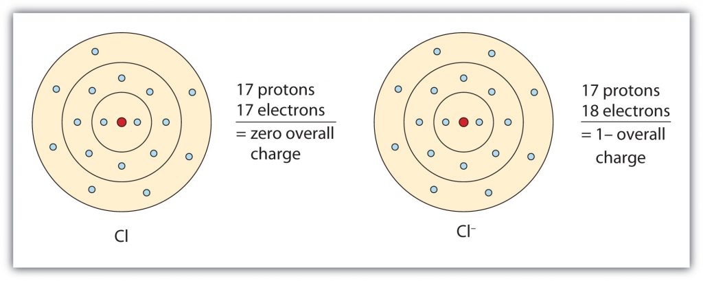 In this case, the ion has the same outermost shell as the original atom, but now that shell has eight electrons in it. Once again, the octet rule has been satisfied. The resulting anion, Cl−, is called the chloride ion; note the slight change in the suffix (-ide instead of -ine) to create the name of this anion. Figure 3.2 “The Formation of a Chlorine Ion” is a graphical depiction of this process.