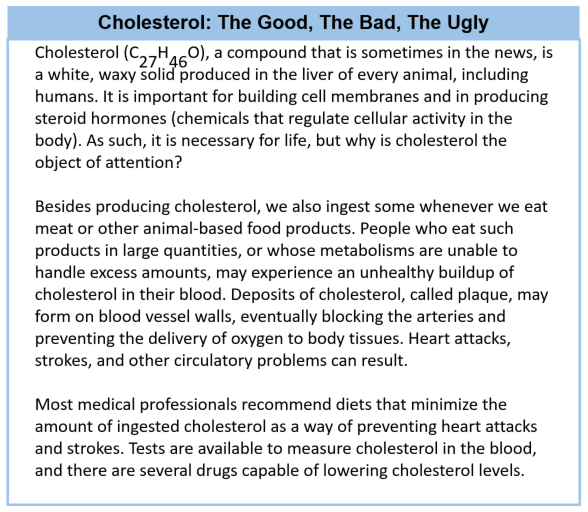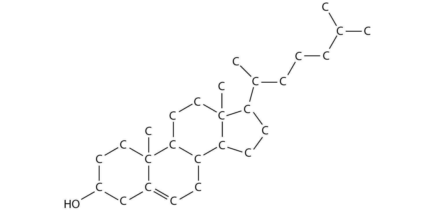 Figure 3.6: A Molecular Model of Cholesterol The structure above shows a molecular model of cholesterol. Note that the hydrogen atoms that are bonded to carbons within the molecule are not shown to save space. In Chapter 5, you will learn more about common shorthand techniques to draw complex organic molecules, like cholesterol.