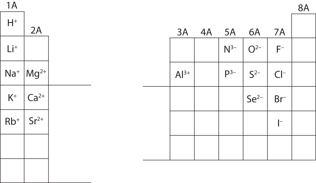 In many cases, elements that belong to the same group (vertical column) on the periodic table form ions with the same charge, because they have the same number of valence electrons. Thus, the periodic table becomes a tool for remembering the charges on many ions. For example, all ions made from alkali metals, the first column on the periodic table, have a 1+ charge. Ions made from alkaline earth metals, the second group on the periodic table, have a 2+ charge. On the other side of the periodic table in the family 7A column, the halogens form ions having a 1− charge. Figure 3.3 “Predicting Ionic Charges” shows how the charge on many ions can be predicted by the location of an element on the periodic table. Note the convention of first writing the number and then the sign on a multiply-charged ion. The barium cation is written Ba2+ not Ba+2.