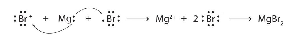 Some ionic compounds have different numbers of cations and anions. In those cases, electron transfer occurs between more than one atom. The following diagram shows the formation of magnesium bromide from two bromine atoms and one magnesium atom: