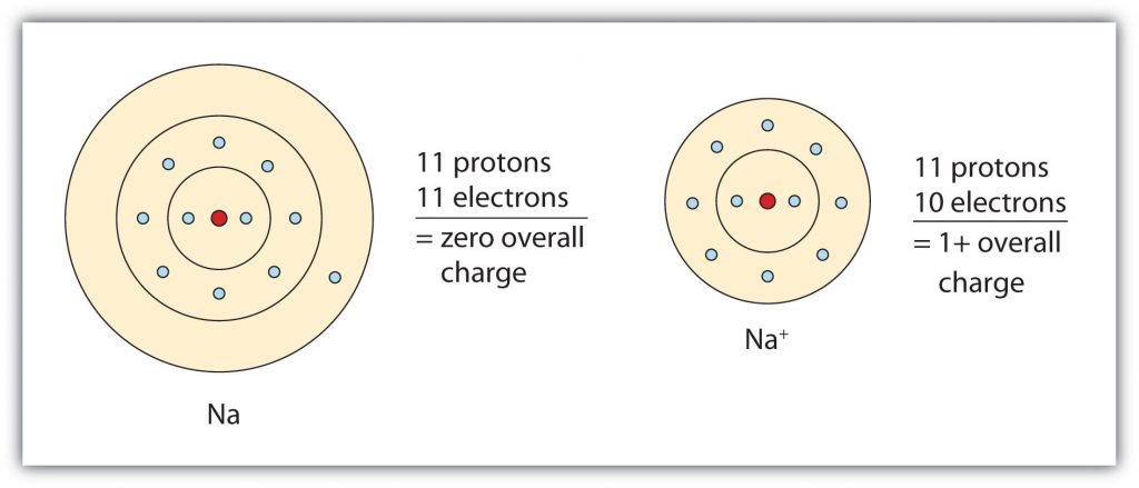 Fig 3.1. The Formation of a Sodium Ion. On the left, a sodium atom has 11 electrons. On the right, the sodium ion only has 10 electrons and a 1+ charge. Note that the sodium ion now has an outer electron shell that has eight electrons, fulfilling the octet rule.