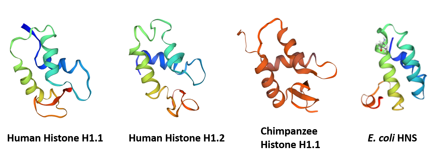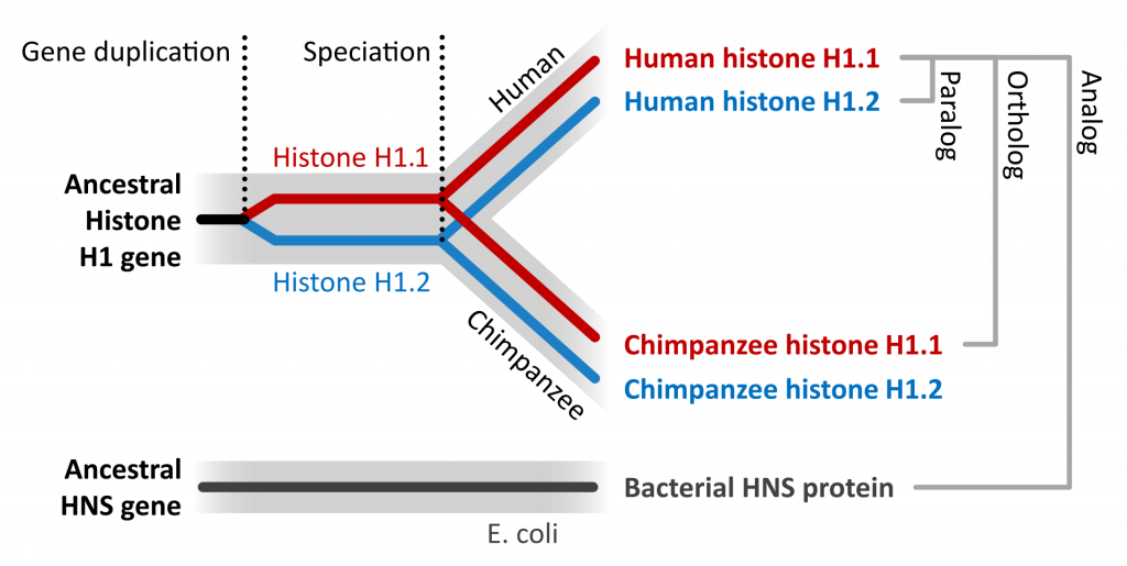 Figure 1.42 Genetic Evolution of Protein Sequences. (Upper Panel) An ancestral gene dupliates to produce two paralogs (Gene A and B). A speciation event produces orthologs in the two daughter species. In a separate species, an unrelated gene has a similar function (Gene C) but has a separate evolutionary origin and so is an analog. (Lower Panel) 3-D protein models were retrieved or modeled using SWISS-MODEL: Human Histone H1.1 (Q02539), Human Histone H1.2 (P16403), E. coli HNS (P0ACF8).  Histone H1.1 from the chimpanzee (Pan troglodytes XP_016810512.1) was modeled using Human Histone H1.1 as a template. Note that the E. coli HNS protein is typically modeled as a dimer. Only a single monomer is shown here.