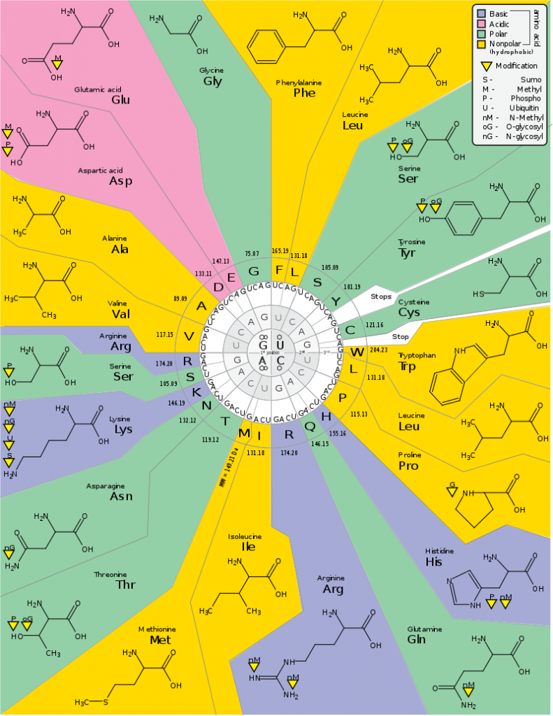 Figure 1.41 The Genetic Code. Image edited by Seth Miller, Original file designed and produced by: Kosi Gramatikoff courtesy of Abgent