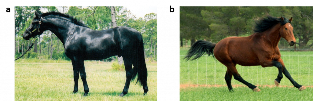 Figure 1.39 Genotype Variations as Determinants of Horse Coat Color. Horses that are capable of producing the black pigment, eumelanin, have at least one copy of the dominant extension gene (E/E or E/e). Interestingly, the agouti gene controls the restriction of true black pigment (eumelanin) in the coat. Horses expressing an extension dominant gene, and are recessive at the agouti gene locus (a/a) will be black in color, as shown in (a). Whereas horses that are dominant for extension (E/E or E/a) but are also dominant for the agouti genotype (A/A or A/a), will never be fully black. Depending on other gene loci, they will instead show coloration patterns such as bay, as shown in (b). Image (a) provided by: Serendipityblue; Image (b) provided by: CMSporthorses
