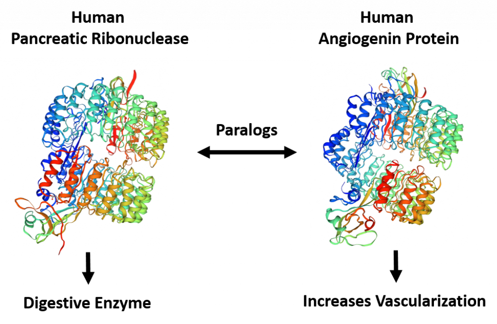 Figure 1.43 Homologous Proteins Do Not Always Have Homologous Functions. In the example above, the digestive enzyme, pancreatic ribonuclease is a paralog of the angiogenin protein and shares an ancestral origin. However, the functions of each of these proteins are quite divergent and have evolved such that they do not share homologous function. 3-D protein models were retrieved using SWISS-MODEL: Human Pancreatic Ribonuclease (P07998) and Human Angiogenin (P03950)