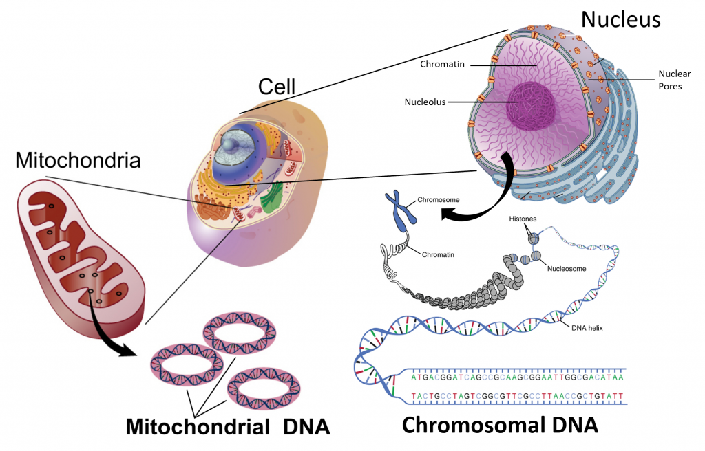 Figure 1.5 The Blueprint for Life is Housed in Deoxyribonucleic Acid (DNA). Within eukaryotic cells DNA is localized to two major places within the cell. The first is the nuclear DNA that forms linear chromosome structures (shown on the right). The second is the circular DNA housed in the mitochondria (shown on the left). The mitochonrdial structures replicate independently of the cell and are thought to have originated as prokaryotic symbionts during the early evolution of the eukaryotic cell type.
