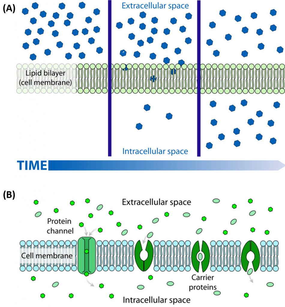 Figure 1.6 The Process of Cellular Diffusion. The movement of small, nonpolar molecules across the plasma membrane and down their concentration gradient occurs by passive diffusion (shown in A). Protein channels or carriers are required for the movement of larger and/or polar molecules, such as water, across the plasma membrane (shown in B). Note that diffusion processes will proceed and equalize concentrations of a molecule until a dynamic equilibrium is reached.