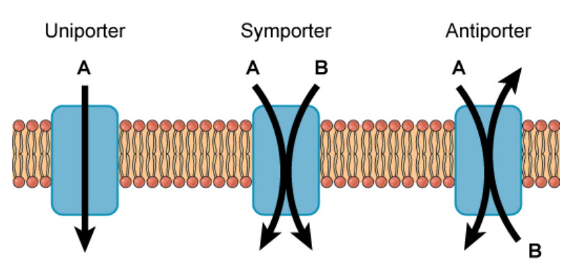 Figure 1.8 Uniporters, Symporters, and Antiporters. Channel, carrier and pump proteins can be classified as uniporters if they only move a single molecule across the plasma membrane, or as symporters if they move two molecules in the same direction, or as antiporters, if they move two molecules across the membrane in opposite directions.