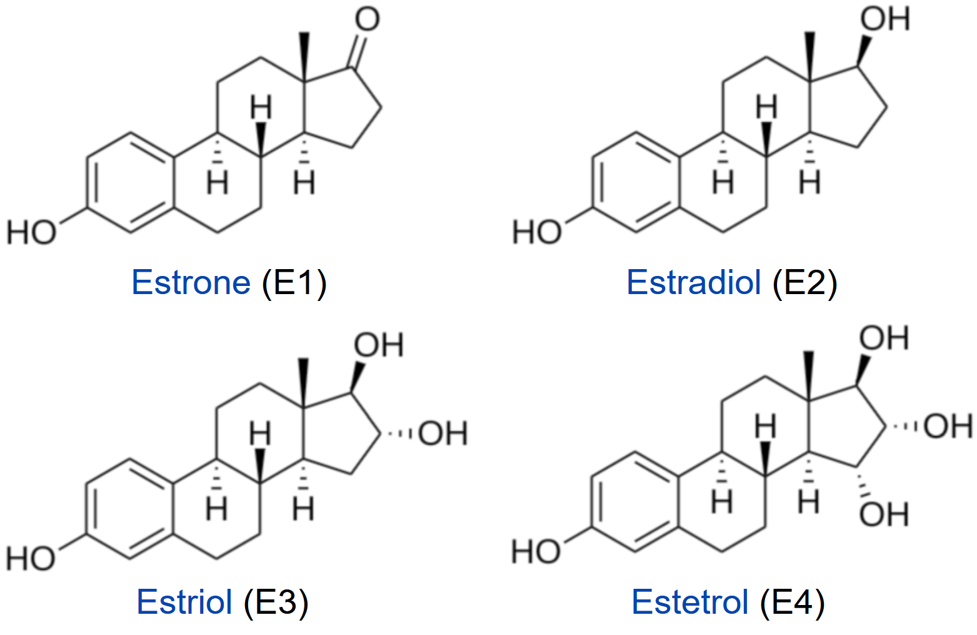 Steroid Hormones, such as the estrogens, reach their target cells via the blood, where they are bound to carrier proteins. Naturally occurring estrogens include estradiol, estrone, estriol, and estretrol and differ primarily in structure on the presence of hydroxyl-groups (Fig. 13.18). Estradiol is the predominant estrogen during reproductive years both in terms of absolute serum levels as well as in terms of estrogenic activity. During menopause, estrone is the predominant circulating estrogen and during pregnancy estriol is the predominant circulating estrogen in terms of serum levels. Another type of estrogen called estetrol (E4) is produced also produced predominantly during pregnancy (Fig 13.18). Estrogens function in many physiological processes, including the regulation of the menstrual cycle and reproduction, maintaining bone density, brain function, cholesterol mobilization, maturation of reproductive organs during development, and they play a role in controlling inflammation.