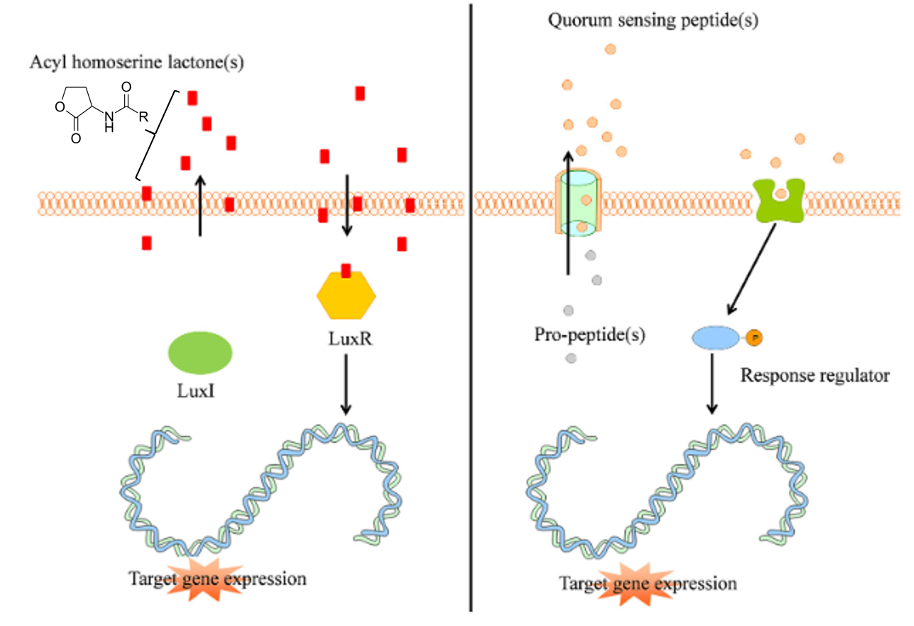 Figure 13.9 Examples of Quorum Sensing Pathways. (Left panel) Typical Gram-negative quorum sensing mechanism. Acyl homoserine lactone molecules, synthesized by LuxI, passively pass the bacterial cell membrane and when a sufficient concentration is reached (threshold level) activate the intracellular LuxR which subsequently activates target gene expression in a coordinated way. Note that a single cell is shown for simplicity. However, acyl homoserine lactones will commonly diffuse and target neighboring cells within the colony to mediate a communal or population response within the bacterial colony. (Right panel) Quorum sensing peptides are synthesized by the bacterial ribosomes as pro-peptidic proteins and undergo posttranslational modifications during excretion by active transport. The quorum sensing peptides bind membrane associated receptors which get autophosphorylated and activate intracellular response regulators via phosphor-transfer. These phosphorylated response regulators induce increased target gene expression.