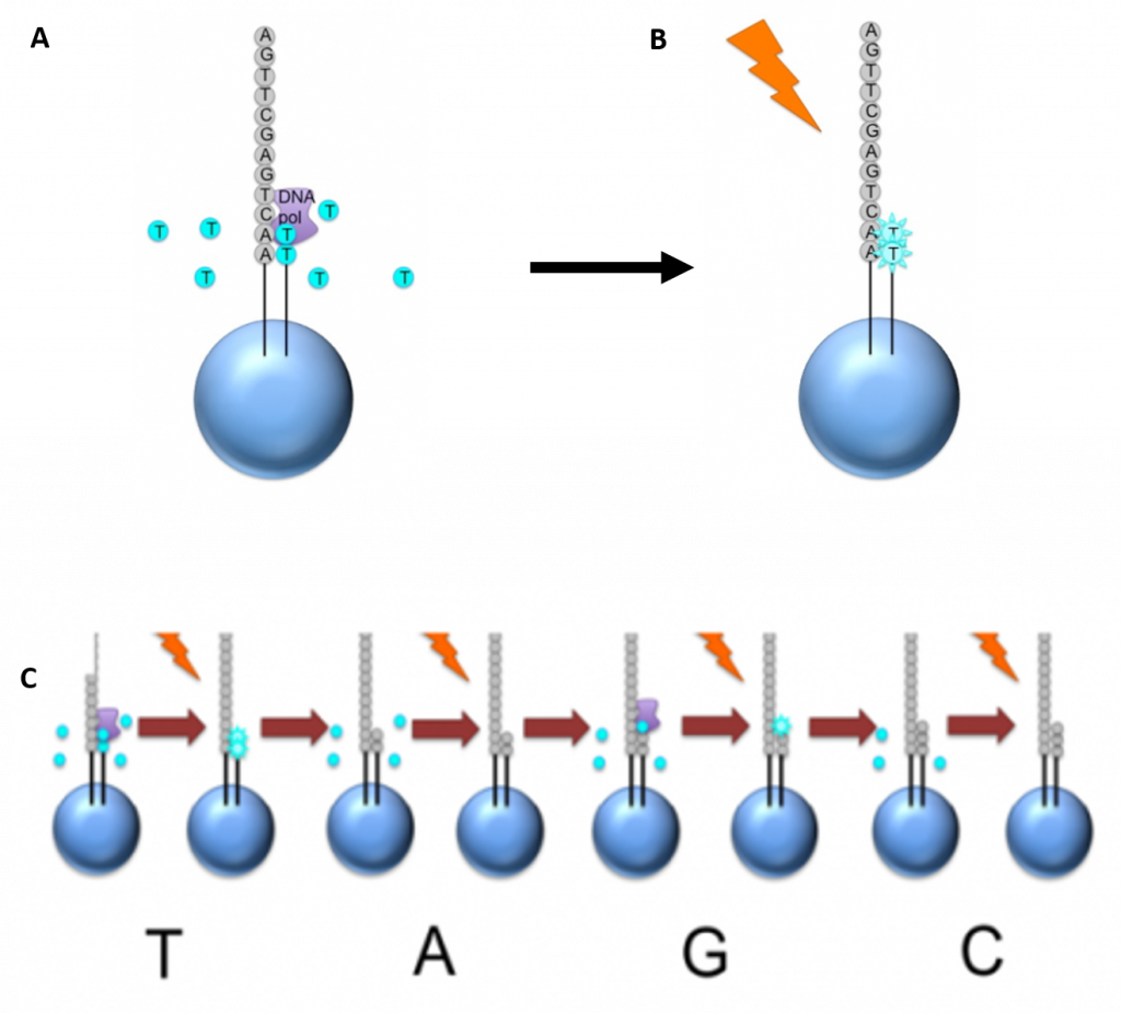 5.10 Procedure for Roche 454 Sequencing. (A) Once the PCR product is attached to the bead, the slide is flooded with one of the four NTP species. Where this nucleotide is next in the sequence, it is added to the sequence read. If that single base repeats, then more will be added. So if we flood with Guanine bases, and the next in the sequence is G, one G will be added, however if the next part of the sequence is GGGG, then four Gs will be added. (B) The addition of each nucleotide releases a light signal. These locations of signals are detected and used to determine which beads the nucleotides are added to. (C) The NTP mix is washed away. The next NTP mix is now added and the process repeated, cycling through the four NTPs. All of the sequence reads from 454 sequencing will be different lengths, because different numbers of bases will be added with each cycle.