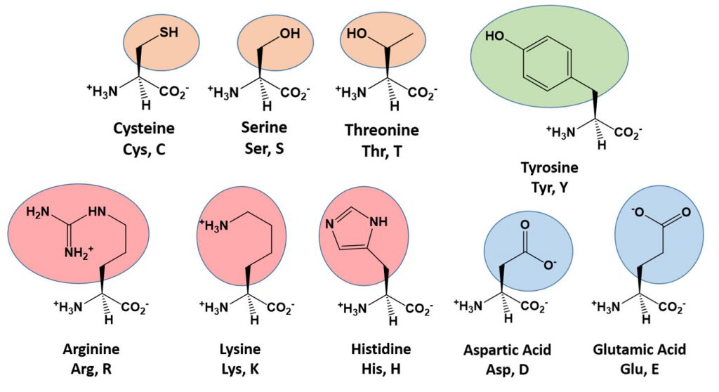 Figure 7.6 Amino Acid R-Groups that Commonly Act as a Nucleophile. Reactive amino acids, that can serve as a nucleophile, are often found in the active site of enzymes and participate in the reaction mechanism.
