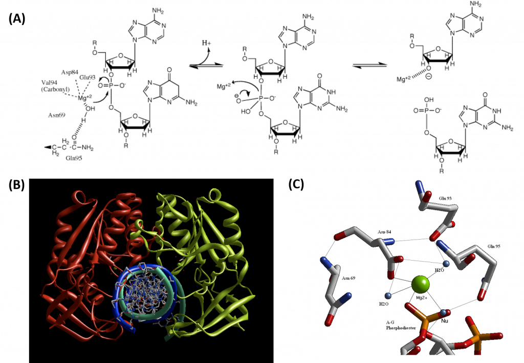 Figure 7.26 Proposed Reaction Mechanism for the Type II Restriction Endonuclease, BglII. (A) Schematic diagram of the catalytic mechanism demonstrating the utility of Mg2+ ions and polar amino acid residues within the active site to activate and position a water molecule for nucleophilic attack on the phosphodiester bond of the DNA substrate. (B) Crystal structure of the BglII dimer with double stranded DNA and (C) Coordination of the Mg2+ cofactor within the active site of the BglII enzyme.