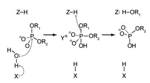 Figure 7.25 A General Mechanism for DNA Cleavage by EcoRI and EcoRV. An activated water molecule attacks the phosphorous in-line wiht the phosphodiester bond to be cleaved, which proceeds with inversion of configuration. X, Y, and Z are a general base, a Lewis acid and a general acid, respectively.