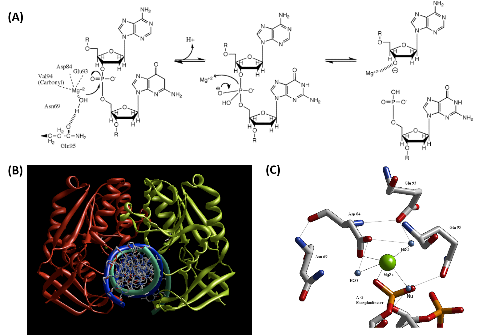 Figure 7.26 Proposed Reaction Mechanism for the Type II Restriction Endonuclease, BglII. (A) Schematic diagram of the catalytic mechanism demonstrating the utility of Mg2+ ions and polar amino acid residues within the active site to activate and position a water molecule for nucleophilic attack on the phosphodiester bond of the DNA substrate. (B) Crystal structure of the BglII dimer with double stranded DNA and (C) Coordination of the Mg2+ cofactor within the active site of the BglII enzyme.