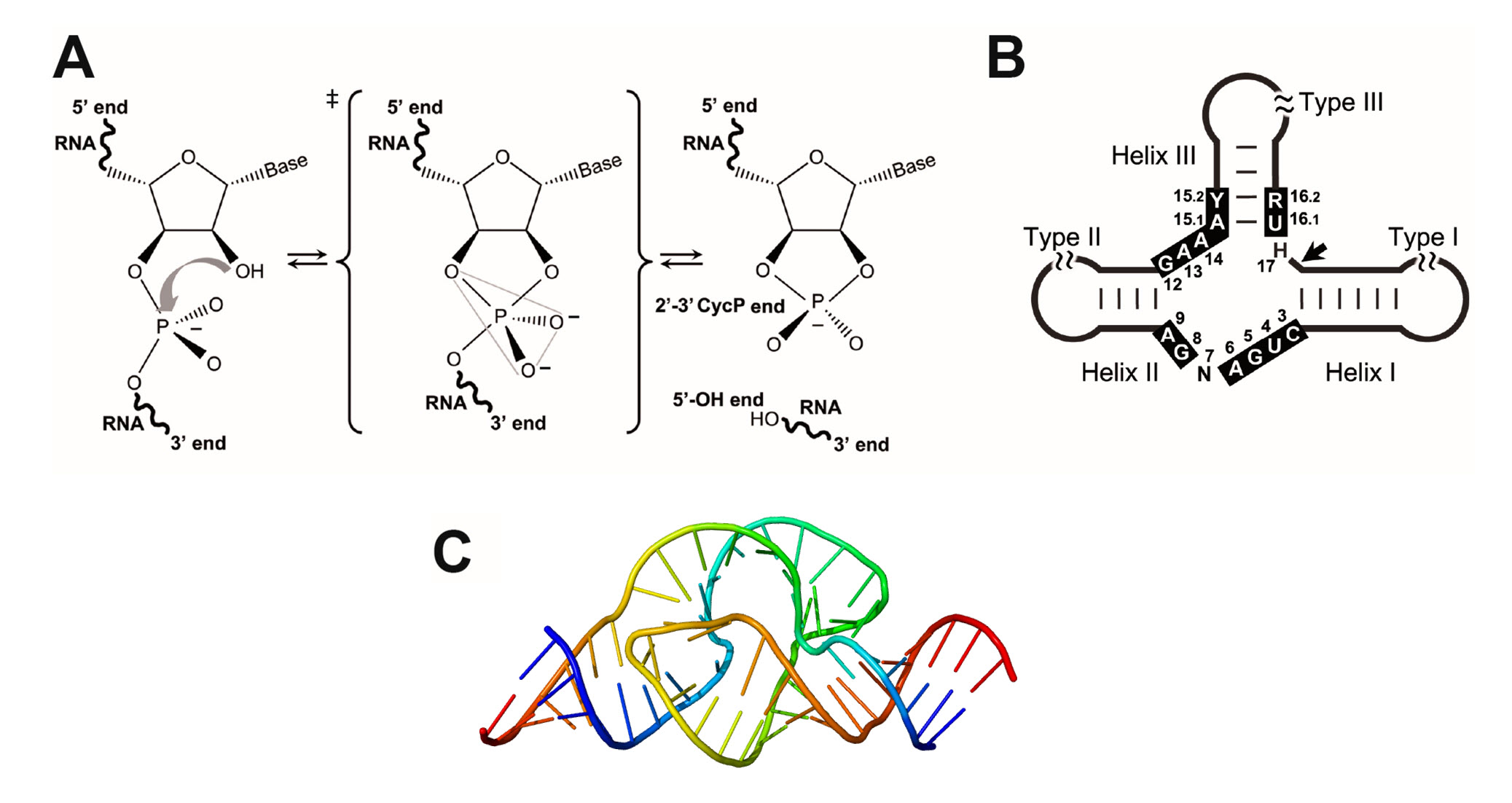 Figure 7.27 The Hammerhead Ribozyme. (A) Mechanism of internal transesterification reaction in the RNA. The cleavage reaction proceeds with an attack of the hydroxyl moiety at 2′ to the phosphate group at 3′, followed by a bipyramidal transition-state. The cleavage products are a 2′-3′-cyclic phosphate at the 5′ RNA product and a 5′-hydroxyl at the 3′ RNA product; (B) Diagram of the hammerhead ribozyme. Black boxes indicate the highly conserved nucleotides at the catalytic core. Secondary structures of (C) 3-Dimensional structure of the Hammerhead Ribozyme.
