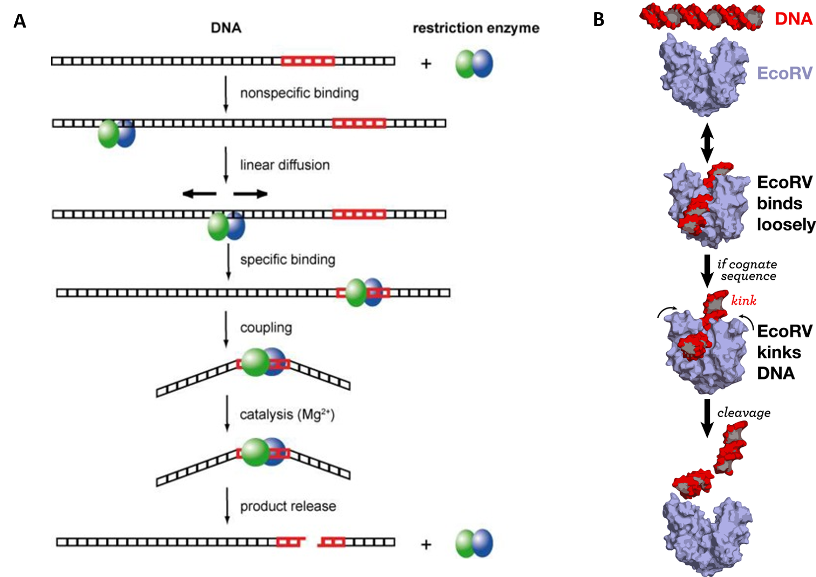 Figure (A) from: Pingoud, A., Wilson, G.G., and Wende, W. (2014) Nuc Acids Res 42(12):7489-7527.  and Figure (B) from: Thomas Splettstoesser