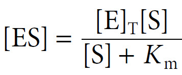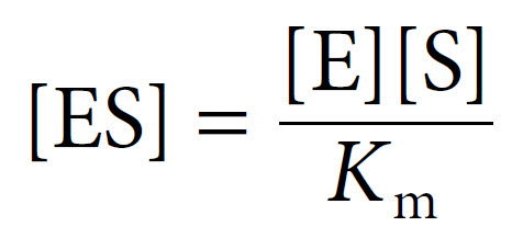 Since the concentration of substrate greatly exceeds the concentration of enzyme (i.e. [S] ≫ [E]), the concentration of uncombined substrate [S] is almost equal to the total concentration of substrate. The concentration of uncombined enzyme [E] is equal to the total enzyme concentration [E]T minus that combined with substrate [ES]. Introducing these terms to into the equation above and solving for ES gives us the following: