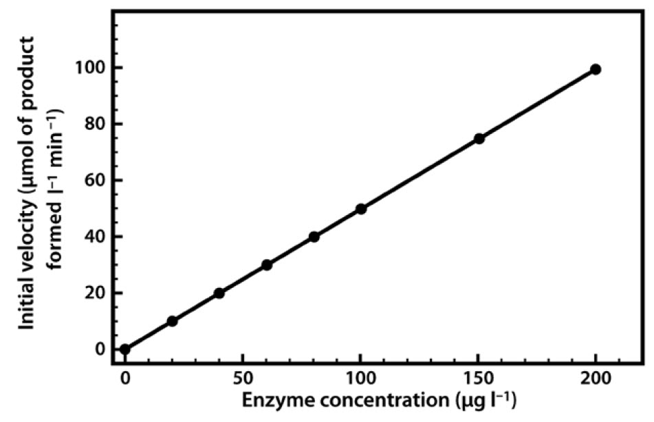 The relationship between enzyme concentration and the rate of the reaction is usually a simple one. If we repeat the experiment just described, but add 10% more enzyme, the reaction will be 10% faster, and if we double the enzyme concentration the reaction will proceed twice as fast. Thus there is a simple linear relationship between the reaction rate and the amount of enzyme available to catalyze the reaction (Figure 6.5). This relationship applies both to enzymes in vivo and to those used in biotechnological applications, where regulation of the amount of enzyme present may control reaction rates.