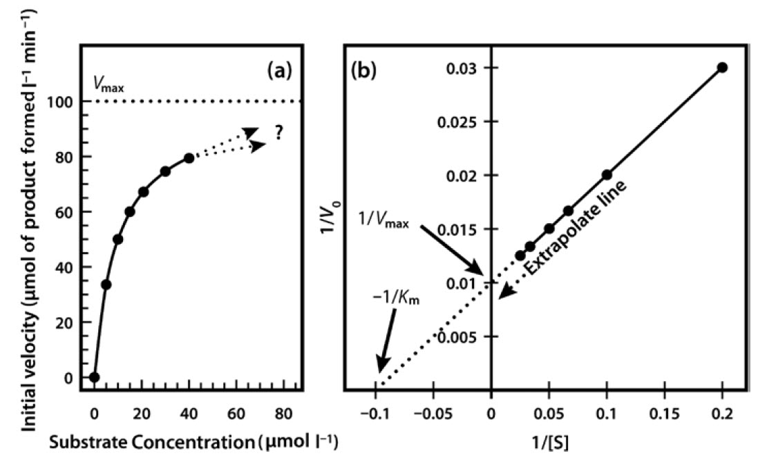Figure 6.7 Michaelis Menton Kinetics. (a) Direct plot of data (b) Lineweaver-Burk plot of the same kinetic data.