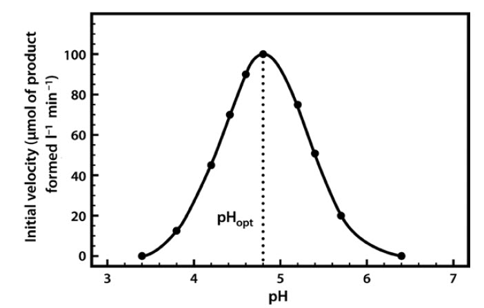 Most enzymes have a characteristic optimum pH at which the velocity of the catalyzed reaction is maximal, and above and below which the velocity declines (Figure 6.9).